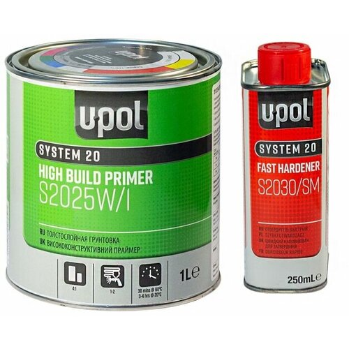 U-POL S2025/1 UHS Грунт наполнитель 4:1 серый + S2030/SM отвердитель быстрый, комплект 1,25л - профессиональный грунт премиум класса, обладающей повышенной жёсткостью и совершенными противоусадочными и антикоррозионными свойствами. Грунты U-POL класса UHS являются универсальными грунтами и дают возможность использовать их как грунты-наполнители, грунты-выравниватели и грунты «мокрый по мокрому». Благодаря своим антикоррозийным свойствам, все 2K грунты U-POL могут наноситься непосредственно на подготовленную стальную поверхностью. Следует сказать, что при работе с алюминиевыми и гальванизированными поверхностями, перед нанесением грунтов рекомендуется применение протравливающего грунта ACID #8. Нужно отметить, что грунт U-POL 4:1 может наносится слоем до 290 микрон. Это очень толстый слой (практически как у жидкой шпаклёвки), который без усадок и растрескиваний обеспечивает заполнение крупных царапин, сколов и др. дефектов. Использование грунтов U-POL разных цветов, значительно экономит расход базовых красок. Разводится грунт с отвердителем в пропорции 4:1 и при этом добавляется растворителя для акриловых материалов от 10 до 20%. Наносится грунт краскопультом с дюзой 1.5-1.8 мм в 2-3 слоя с межслоевой выдержкой 10-15 мин. Грунт пригоден к использованию после смешивания с отвердителем в течении часа. Сушка при 20градусах тепла около 1-2 часов, при 60 градусах около 20 минут. Обрабатывать мокрым шлифованием абразивом с зернистостью 600-800ед, либо сухим способом абразивом зернистостью 280-400 ед. Благодаря высочайшим эксплуатационным качествам грунты марки U-POL являются профессиональным материалом премиум класса и используется в дилерских центрах кузовного ремонта.