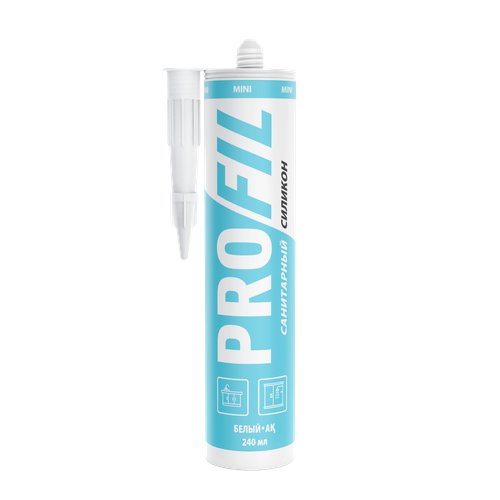 Санитарный силикон Profil Mini – качественный эластичный однокомпонентный герметик на основе силикона.Применяется для герметизации строительных и конструкционных швов, в соединениях в ванных комнатах и на кухнях, в соединениях холодильных помещений. Прекрасно подходит для заделки щелей между стеной и раковиной.Может использоваться для герметизации в системах кондиционирования воздуха.Санитарный герметик Profil Mini прост в нанесении, обладает хорошей адгезией к множеству строительных материалов (за исключением ПВХ, акрила, ПП, ПЭ и тефлона). После отверждения сохраняет эластичность. Стоек к ультрафиолетовому излучению, имеет стабильный цвет. Содержит фунгициды.Технические характеристикиОснова — полисилоксанКонсистенция — стабильная пастаМеханизм отверждения — влажностная полимеризацияОбразование поверхностной пленки — 20 минпри температуре +20°C и относительной влажности 65%Скорость отверждения — 2мм/суткипри температуре +20°C и относительной влажности 65%Твердость — 15±5Шор АПлотность — 0,95г/млТемпературный диапазон эксплуатации — от -60 до +120°CМаксимально допустимая деформация — 25%Модуль эластичности — 0,23Н/мм?DIN 53504Предел прочности — 1,45Н/мм?DIN 53504Относительное удлинение при разрыве — 800%Температурный диапазон применения — от +5 до +35°CСредний расход — 25мл/п.м.при ширине шва 5 мм и толщине слоя 5 ммСпособ примененияСанитарный силиконовый герметик Profil Mini наносится на герметизируемую поверхность при помощи ручного или пневматического выдавливающего пистолета.Свежий силикон может быть удален с помощью уайт-спирита непосредственно после нанесения.