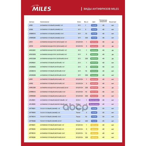 ![]() | 2560 ₽ | 24.06.2024 Антифриз G11 Miles Готовый 10кг (Зеленый) Miles арт. AFGR010 | |