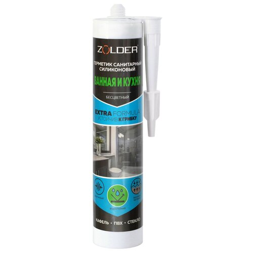 Герметик Zolder силиконовый санитарный 280мл.Санитарный силикон представляет из себя однородный, быстро затвердевающий уплотнитель, который в реакции с атмосферной влажностью создает стойкий, эластичный шов. Содержит средства, предотвращающие появление и развитие плесени и грибка. Выдерживает большие разницы температур, ультрафиолет, между тем как его физические свойства остаются неизменными в течении нескольких лет. Санитарный силикон характеризуется отличной сцепляемостью с гладкими поверхностями, например стекло, глазурь, керамика, алюминий, покрытыми поверхностями и большинства пластмасс.