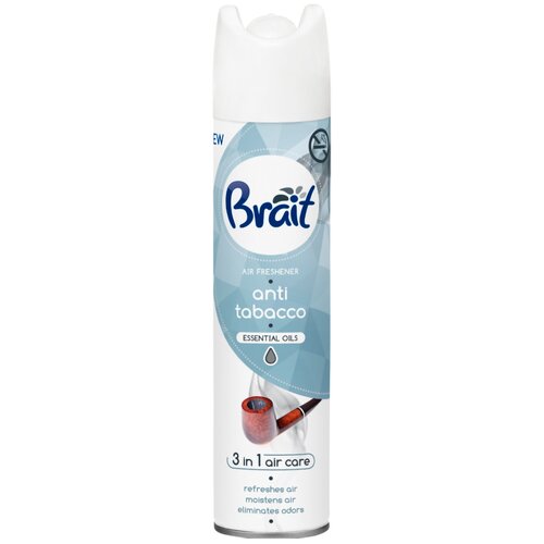 Освежитель воздуха 3в1 Brait ANTI TABACCO (300 мл), против запаха Табака. Освежитель воздуха Brait Анти-Табак легко избавит Вас от надоедливого запаха табачного дыма в любом помещении. Используйте его, чтобы избавить от неприятного запаха табака. Формула 3 в 1 обеспечивает: Эффективно нейтрализует и поглощает неприятный запах. Наполняет помещение неповторимым ароматом. Придает ощущение свежести и чистоты. Бренд Brait существует на рынке уже 20 лет, предлагая широкий ассортимент освежителей воздуха и товаров бытовой химии. За это время он завоевал доверие клиентов, которые ценят, прежде всего, высокое качество и эффективность продукции, благодаря использованию инновационных формул.