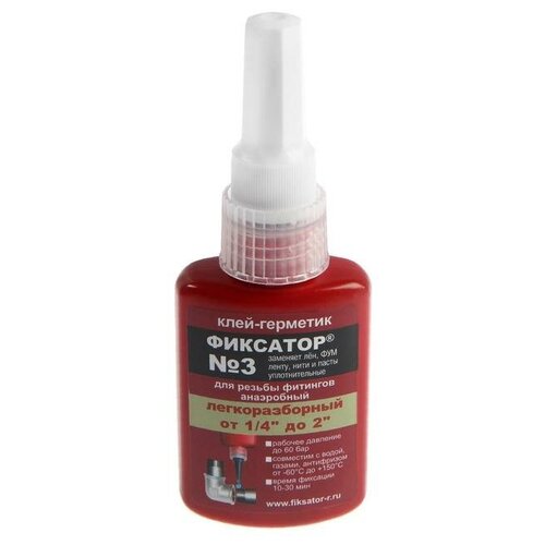 Анаэробный клей-герметик MasterProf Фиксатор №3 предназначен для фиксации и герметизации резьбовых соединений фитингов трубопроводов размером от 1/4" до 2", испытывающих умеренные вибрационные нагрузки. Применим в системах горячего и холодного водоснабжения, отопления, газоснабжения, подачи сжатого воздуха, гидравлических жидкостей. Отверждается в резьбовых зазорах с образованием термореактивного полимера.