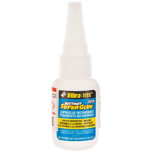 Цианоакрилатный моментальный клей Vibra-Tite 306 относится к клеям низкой вязкости, благодаря чему отлично растекается. Данный клей обладает высочайшей скоростью фиксации и может применяется с любыми материалами. Отлично подходит для склейки предварительно собранных неактивных поверхностей.