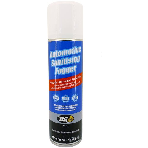 BG703 Автоматический спрей дезинфекторОбъем 242 млBG 703 W2AF Sanitizing Fogger Данный продукт уничтожает вирусы и предотвращает их появление, убивает все негативные бактерии на поверхностях салона автомобиля: прежде всего на поверхности приборной панели, руля, текстильных наполнений дверей, ковровых покрытий и других частей салона авто. Официально аттестованный дезинфектор для кондиционера и салона автомобиля против COVID-19, бактерий, плесени и вирусов.BG703 — это первый продукт BG Products, сертифицированный органами EPA и Health Canada, который зарегистрирован и утвержден в качестве дезинфицирующего средства для применения в отношении атипичной пневмонии (SARS-CoV-2, следовательно, вируса, который вызывает COVID-19).Протестирована и доказана высокая эффективность данного продукта. Процесс дезинфекции салона авто и системы кондиционирования после летнего периода убирает из салона неприятные запахи и снижает риск аллергии на шерсть животных или пылевых клещей.Регламент и нормы использования:Включите клавишу рециркуляция воздуха в салоне.Зажмите на несколько секунд спрей (чтобы он стал автоматически распылять) и поставьте на пол салона.Закройте все двери, стекла и люки вашего автомобиля на 10-15 минут (на время действия спрея).После проветрите салон в течение 15 минут (спрей имеет специфических запах).Все готово! Процедура занимает всего 30 минут, и Ваше авто полностью продезинфицировано.