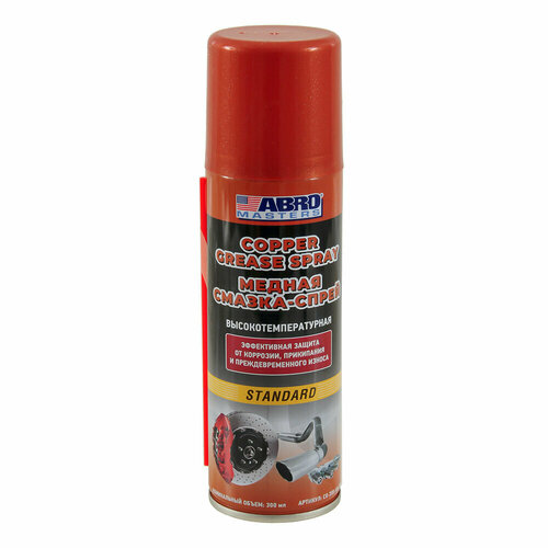 Высокотемпературная медная смазка ABRO MASTERS 200 мл CG-200-AM-RW – высокотемпературная многоцелевая смазка для распыления на литиевой основе. При распылении создаётся полутвердая плёнка, которая защищает деталь от прикипания, истирания, преждевременного износа, коррозии и, самое главное, работает в условиях высоких температур. Медная смазка-спрей разработана специально для смазки стальных и пластиковых деталей, подвергающихся высокой термической нагрузке: шестерни, подшипники, шпильки выпускного коллектора, части трмозной системы, соединения глушителя, резьбовые части свечей зажигания, шпильки и посадочные поверхности ступиц колёс, различные фланцевые и резьбовые соединения.