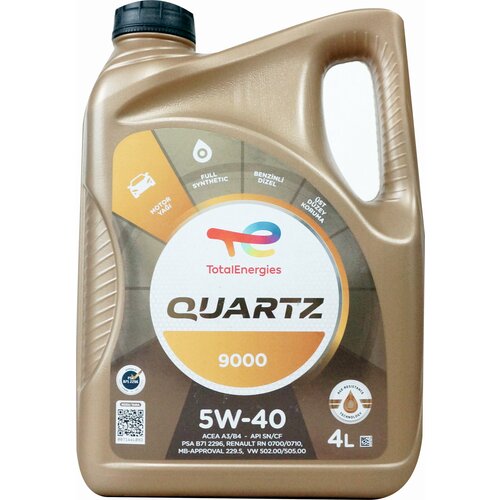Автомасло TOTAL QUARTZ 9000 5W-40 - это энергосберегающий полностью синтетический смазочный материал, рекомендованный к применению в бензиновых и дизельных двигателях, включая оборудованные турбонаддувом. Имеет официальные одобрения мировых производителей. Адаптировано для автомобилей, оснащенных катализатором, также использующих неэтилированный бензин или сжиженный нефтяной газ в качестве топлива. Машинное масло Тотал Кварц эффективно защищает от износа, образования отложений и окисления при высоких температурах. Благодаря своей вязкости, всесезонная жидкость Total может использоваться в широком диапазоне температур, облегчая запуск мотора зимой и обеспечивая надежную смазку летом. Автотовар для европейских или американских машин Total гарантирует значительную топливную экономичность, а также продлевает эксплуатационный срок службы мотора. Упаковка объемом 4 литра