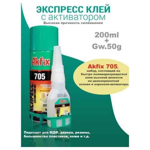 Клей Akfix 705 представляет собой высококачественный, высокоэффективный, универсальный двухкомпонентный цианакрилатный клей нового поколения с активатором в аэрозольном баллоне. Комплект состоит из вязкого геля цианакрилата и аэрозоля активатора. Цвет — бесцветный. Внешний вид клея — вязкий гель. Внешний вид активатора — аэрозоль.