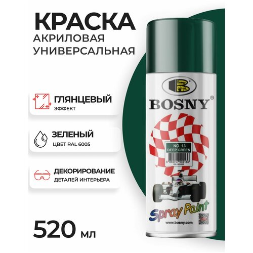Аэрозольная краска в баллончике Bosny №13 акриловая универсальная, цвет зеленый, RAL 6005 (BOSNY NO. 13), 520 мл