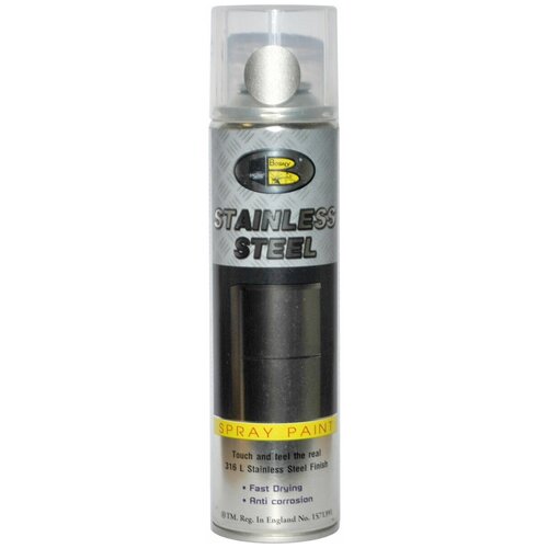 Аэрозольная краска Bosny нержавеющая сталь SS предназначена для создания глянцевой поверхности по виду и свойствам похожую на нержавеющую сталь.Краска состоит из чистого порошка нержавеющей стали 316L.Состав обеспечивает защиту от коррозии, воды и атмосферных явлений.Способ применения:Поверхность должна быть очищена от жира, воска, влаги и т.д.Наносите краску с расстояния 20 см несколькими тонкими, прозрачными слоями.Слегка напылите спрей-краску на объект и дайте подсохнуть 15-20 минут, после чего нанесите следующий слой.После окончания работы немедленно прочистите распылительный клапан, перевернув баллончик вверх дном и нажимая кнопку в течение 10 секунд.