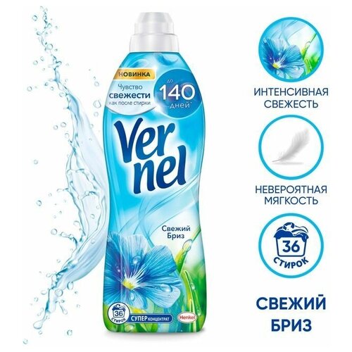 Кондиционер для белья Вернель Свежий Бриз 910 мл, (36 стирок) придает белью, мягкость, облегчает глажку и обладает антистатическим эффектом. Концентрированная формула с новой технологией нейтрализации неприятных запахов обеспечивает защиту свежести до 140 дней при хранении белья без использования. Кондиционер Вернель подходит для регулярного ухода за бельем, благодаря эффективности и простоте использования.