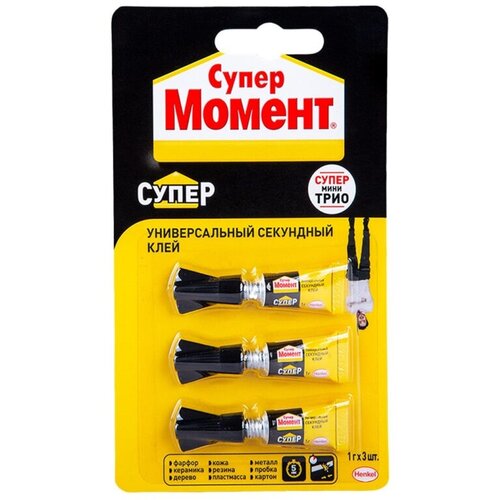 Клей универсальный секундный Момент Мини-трио предназначен для склеивания различных видов пластмасс, резины, металлов, дерева, фарфора, керамики, кожи, пробки, тканей, картона и бумаги. Не пригоден для склеивания полипропилена, полиэтилена, политетрафторэтилена (тефлона), стекла, глазированных поверхностей и силиконовой резины. Не пригоден для склеивания полипропилена, полиэтилена, политетрафторэтилена (тефлона), стекла, глазированных поверхностей и силиконовой резины. Не применим для склеивания посуды, в которую будет наливаться горячая жидкость и посуды, которая может контактировать с пищей. Срок годности 18 мес. В коробке - 12 штук. Внешний вид и/или характеристики товара могут быть изменены производителем в соответствии с производственным процессом.