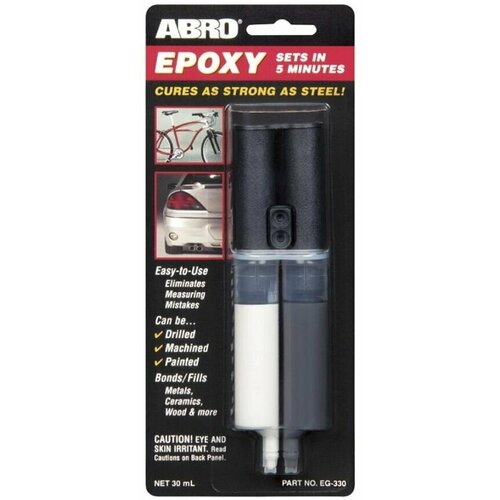 Клей эпоксидный 330 в шприцах 30 мл. ABRO EG-330. Предназначен для склеивания металла, стекловолокна, стекла, бетона, керамики, фарфора, резины и большинства пластмасс. Легок в использовании благодаря удобному и равномерному дозированию. Не дает усадку, не расширяется при отверждении. Мгновенное схватывание через 5 минут. Склеенное изделие можно полировать, сверлить, красить. Имеет высокую устойчивость к воде, моющим средствам и большинству растворителей. Заполняет пустоты и трещины, восстанавливает форму и объем изделия.