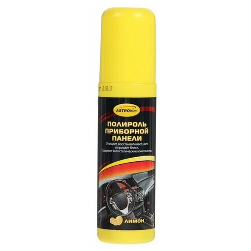 ASTROhim Полироль приборной панели, аромат Лимон, спрей, 125 мл АС-2305 - Эффективное очищающее и полирующее средство для ухода за пластиковыми, виниловыми и резиновыми элементами интерьера автомобиля.Очищает от загрязнений, восстанавливает цвет и придает шелковистый блеск. Содержит антистатические компоненты, предотвращающие притягивание пыли к приборной панели. Не оставляет жирной и липкой пленки. Защищает от разрушительного действия солнечных лучей, предотвращает выгорание и растрескивание пластика. Обладает приятным ароматом.Способ применения:Перед использованием энергично встряхните баллон в течение 1-2 мин. Нанесите полироль тонким слоем на обрабатываемую поверхность. Через 2-3 минуты располируйте чистой сухой тряпкой.Внимание! Не используйте под воздействием прямых солнечных лучей и на горячей поверхности. Не используйте на руле, рычаге коробки передач, рычаге ручных тормозов, на педалях – они могут стать скользкими, что может привести к потере управляемости автомобилем."