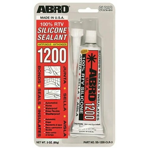 Герметик силиконовый прозрачный 85гр ABRO SS-1200-CLR-3 (производство США). Силиконовый универсальный герметик ABRO 1200 - это долговечный клейкий герметик на основе уксусной кислоты, применяемый в различных целях для внутренних и наружных работ. Обладает высокой адгезией к большинству металлов, окрашенным поверхностям, не маслянистому дереву, пластмассе, каучуку, стеклу, фарфору и керамике. После отвердевания герметик становится водостойким, сохраняет эластичность и устойчив к механическим и температурным воздействиям. Преимущества прозрачного силиконового герметика ABRO 1200: Принимает любую форму и успешно выдерживает сжатие, растяжение и сдвиг.