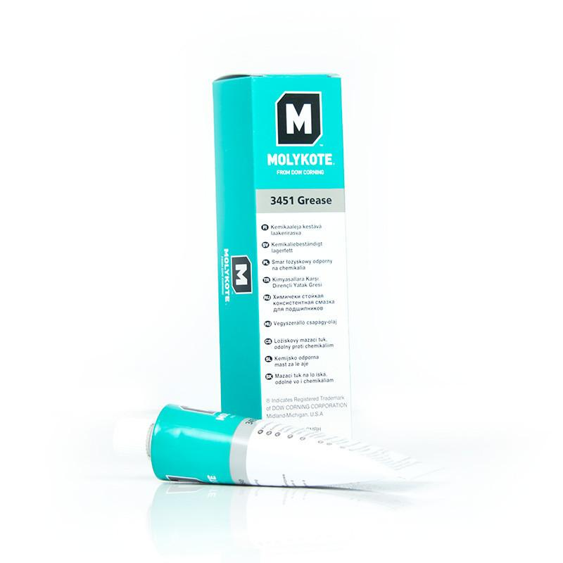 Фторсиликоновая стойкая пластичная смазка Molykote 3451 предназначена для высоких нагрузок. Её можно использовать для подшипников качения и скольжения, направляющих скольжения и качения, а также гибких валов в оболочках.