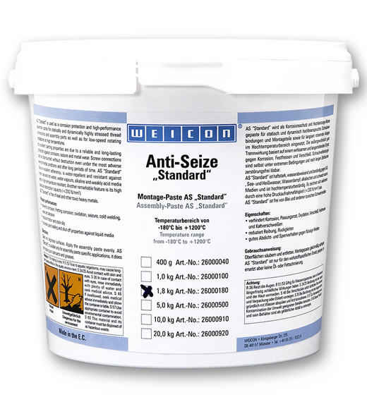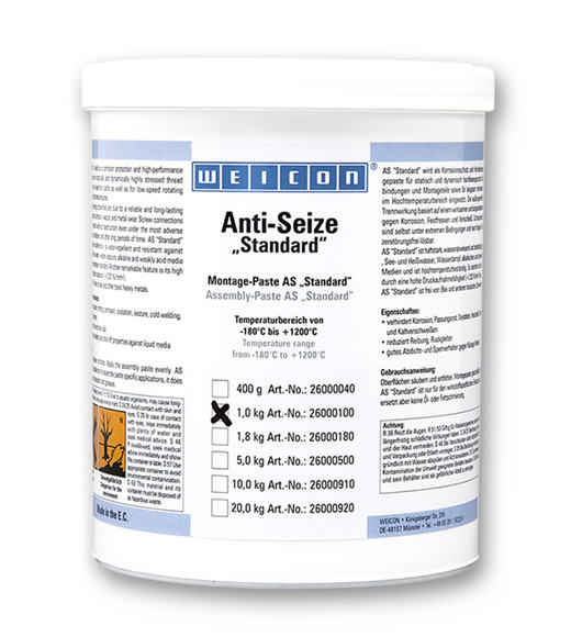 Монтажная паста Weicon AS 180000 Anti-Seize обеспечивает антикоррозийную защиту для резьбовых соединений и монтажных деталей, подверженных предельным статическим и динамическим нагрузкам, а также для медленно вращающихся установок, работающих в диапазоне высоких температур.